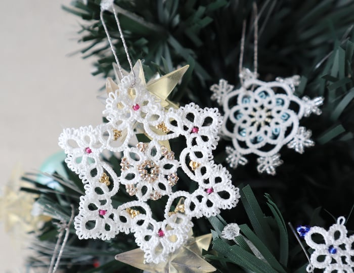 真っ白のレース糸で結い上げたタティングレ―スのオーナメントです。